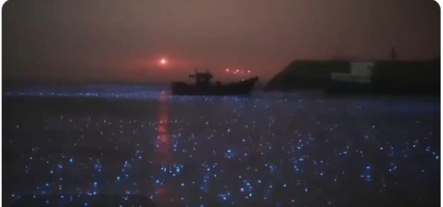 وأظهرت مقاطع فيديو متداولة تألق الشواطئ ليلاً بهذا التوهج المميز،