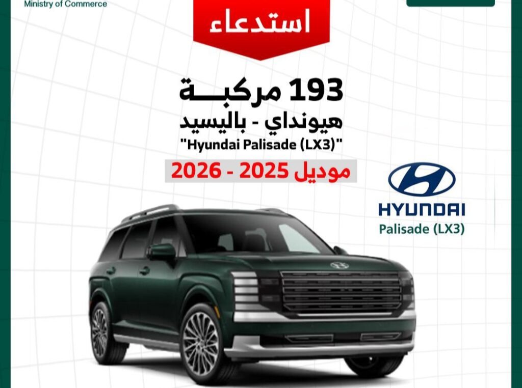 أعلنت وزارة التجارة السعودية عن استدعاء 193 مركبة من طراز هيونداي باليسيد موديلات 2025 و2026، وذلك لوجود خلل تقني قد يشكل خطرًا على سلامة الركاب.