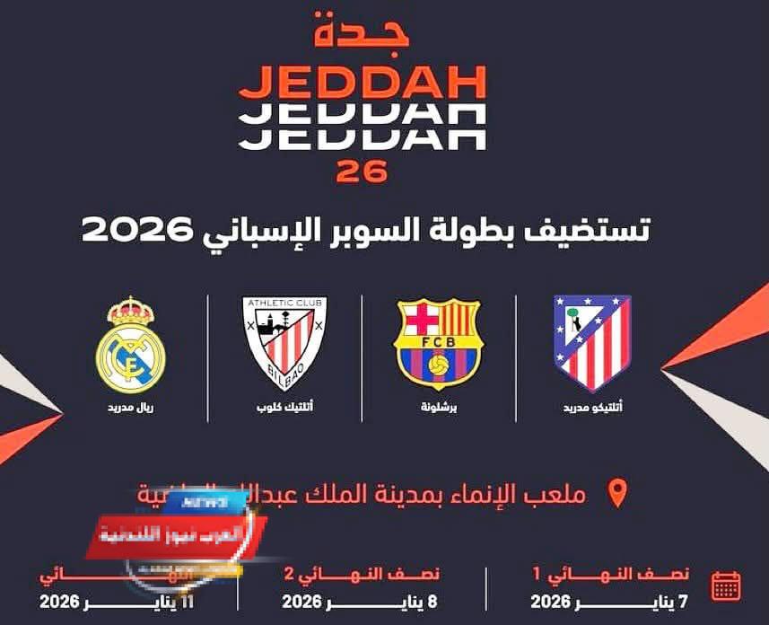 أعلن الاتحاد الإسباني لكرة القدم رسميًا أن كأس السوبر الإسباني سيُقام في مدينة جدة بالمملكة العربية السعودية، خلال الفترة من 7 إلى 11 يناير 2026، بمشاركة أربعة من أبرز الأندية الإسبانية.
