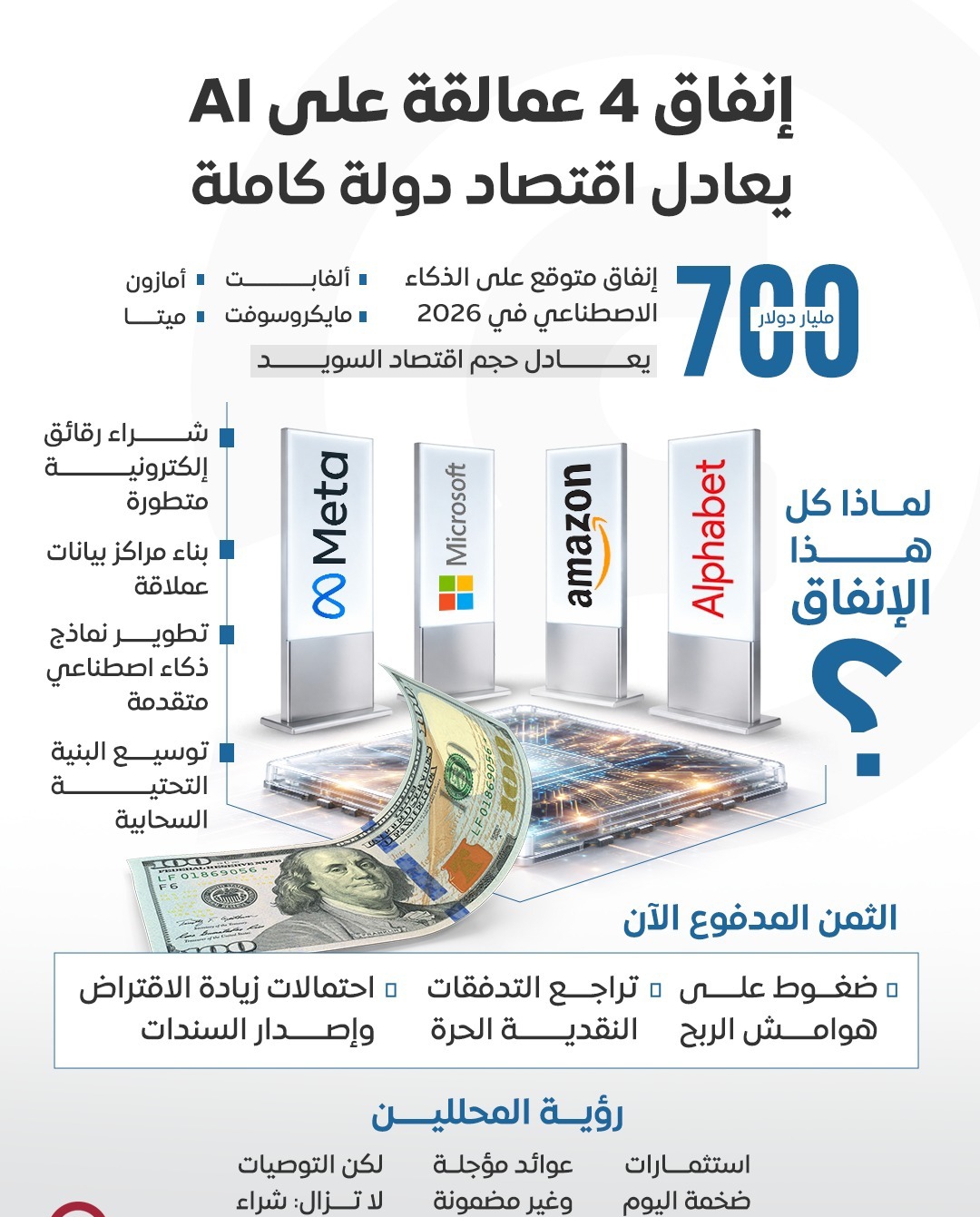 بمقارنة هذا الإنفاق مع الناتج المحلي الإجمالي لاقتصاد السويد — الذي يُقدر بنحو 600–700 مليار دولار سنويًا — يتضح أن إنفاق الشركات الأربعة على الذكاء الاصطناعي وحده يعادل حجم اقتصاد دولة كاملة. وهذا يعكس التحوّل العميق نحو اقتصاد المعرفة والاعتماد المتزايد على الذكاء الاصطناعي كمحرك رئيسي للنمو الاقتصادي والتكنولوجي في العقد المقبل.