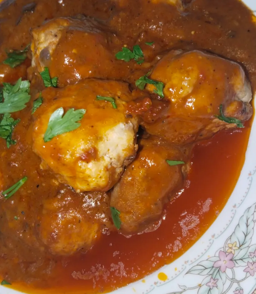 تُضاف الكفتة المقلية إلى الصلصة وتُترك على نار هادئة لمدة 5 دقائق حتى تتشرب الكفتة نكهة الصلصة جيدًا.