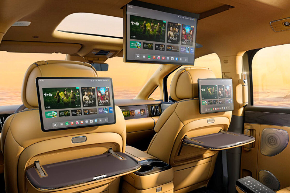 داخلية السيارة تتميز بلوحة قيادة على شكل حرف T، ومقاعد الصف الثاني مستوحاة من الطائرات مع طاولات قابلة للطي، وشاشتين خلف المقاعد الأمامية، وشاشة سقفية، وشاشات تحكم في مساند الأذرع، لتوفير الترفيه والراحة في ثلاثة صفوف من المقاعد.