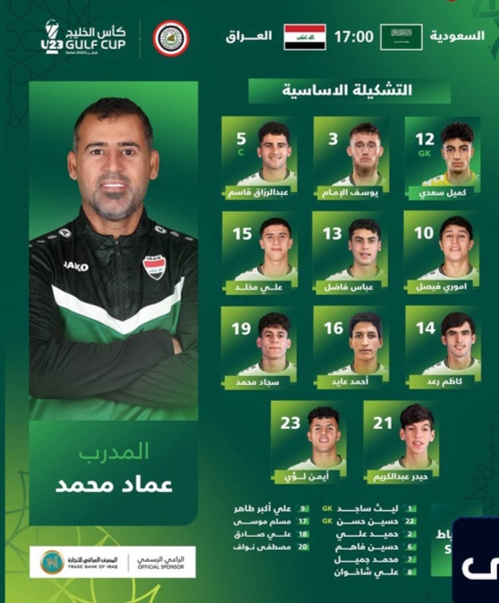 التشكيلة الأساسية لمنتخب العراق الأولمبي لمواجهة السعودية في نهائي كأس الخليج تحت 23سنة