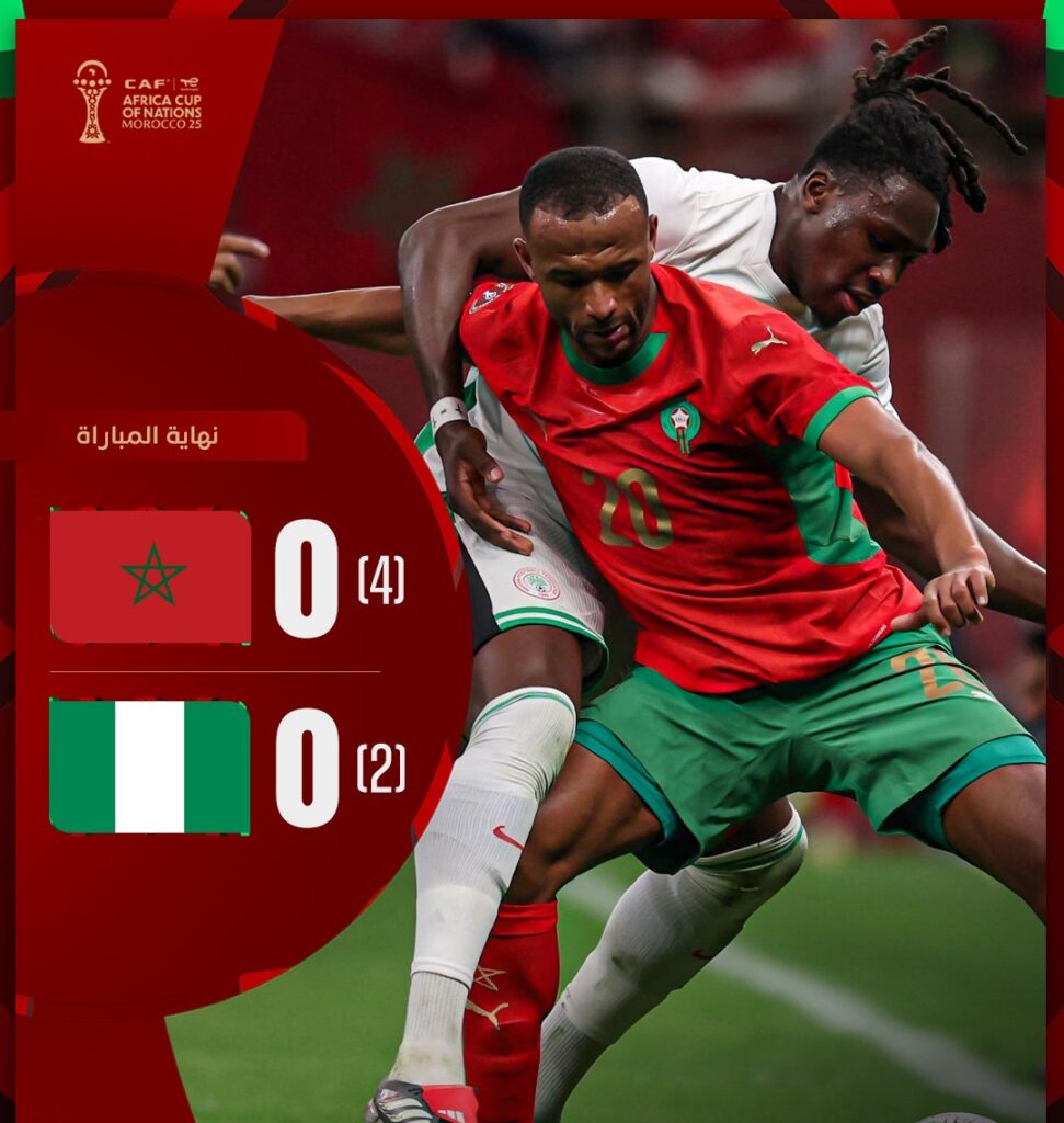 تأهل منتخب المغرب إلى نهائي كأس أمم إفريقيا 2025 لأول مرة منذ عام 2004، بعد أن تعادل مع منتخب نيجيريا سلبيًا 0-0 في الوقتين الأصلي والإضافي من نصف النهائي، قبل أن يحسم الفوز لصالحه بركلات الترجيح في نهاية اللقاء، في مباراة قدم فيها «أسود الأطلس» أداءً دفاعيًا قويًا أمام هجوم ضاغط من «نسور إفريقيا».