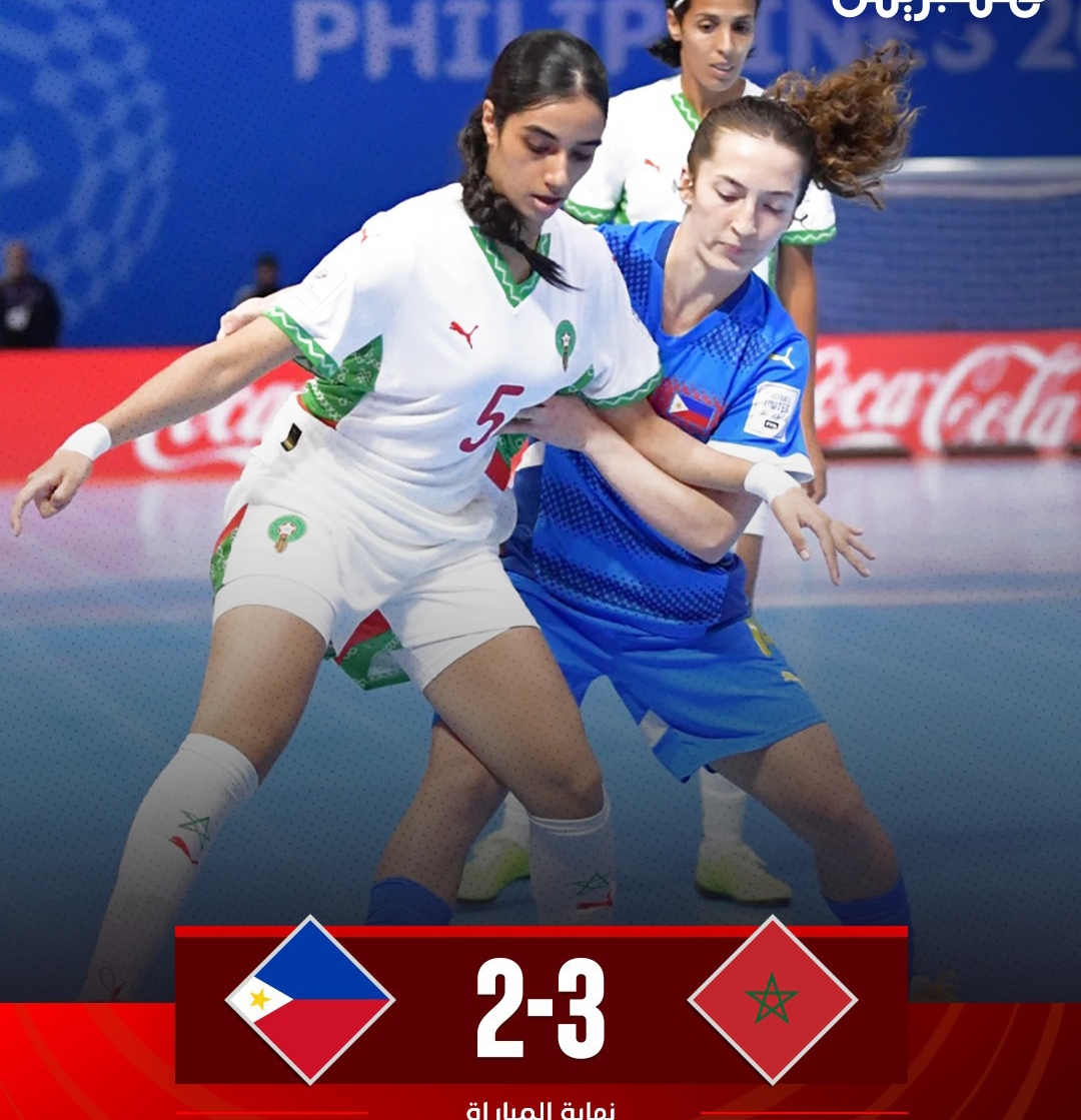 حقق منتخب سيدات المغرب لكرة القدم داخل القاعة (الفوتسال) فوزًا مستحقًا ومثيرًا على نظيراته من *الفلبين*، ضمن منافسات الجولة الثانية من دور المجموعات في *كأس العالم 2025*، المقامة حاليًا في الفلبين. هذا الانتصار يعكس الأداء المتميز والجاهزية العالية التي أظهرتها اللاعبات المغربيات في البطولة، ويعزز من فرصهن للتأهل إلى الأدوار الإقصائية.