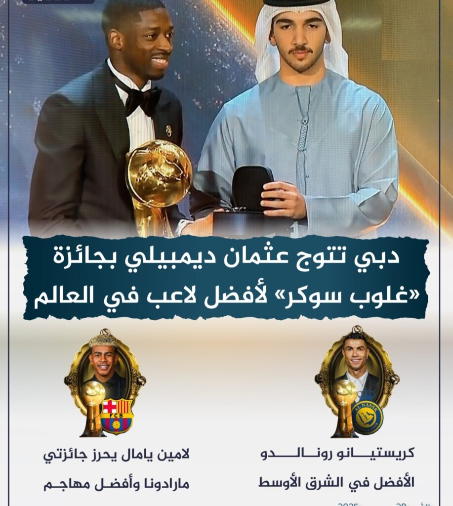 تُوِّج النجم الفرنسي عثمان ديمبيلي بجائزة غلوب سوكر لأفضل لاعب في العالم، خلال الحفل العالمي الذي استضافته مدينة دبي، وسط حضور نخبة من نجوم كرة القدم وصنّاع القرار الرياضي.