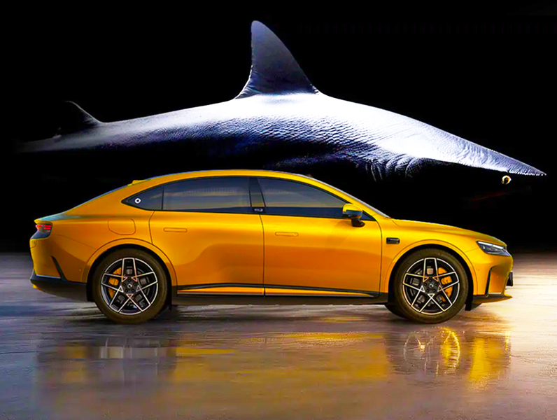 يبرز في الواجهة الأمامية غطاء محرك يتضمن قنوات هواء وظيفية تحمل اسم “خياشيم القرش”، بينما يضم الجزء الخلفي جناحاً قابلاً للتعديل بأربع وضعيات يحاكي حركة الذيل.