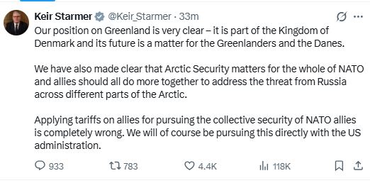 انتقد رئيس الوزراء البريطاني كير ستارمر تهديدات الرئيس الأميركي دونالد ترامب بفرض رسوم جمركية على عدد من الدول الأوروبية على خلفية التوتر المرتبط بقضية غرينلاند، واصفًا هذه الخطوة بأنها «خاطئة تمامًا» وقد تلحق ضررًا بالعلاقات عبر الأطلسي.