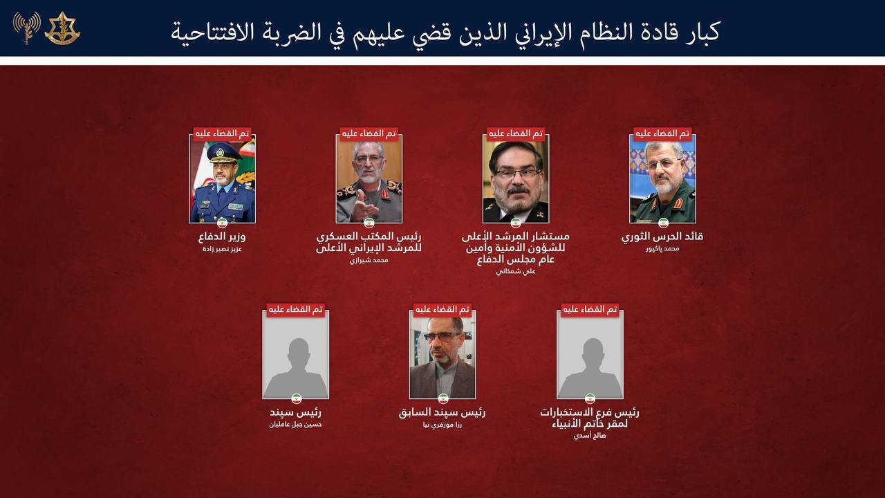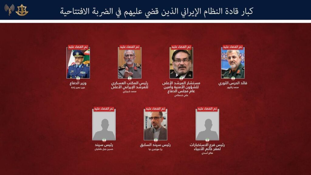 أعلن الجيش الإسرائيلي، مساء السبت، أنه نفّذ سلسلة ضربات جوية داخل إيران أسفرت – بحسب قوله – عن اغتيال عدد من كبار المسؤولين الحكوميين والعسكريين.